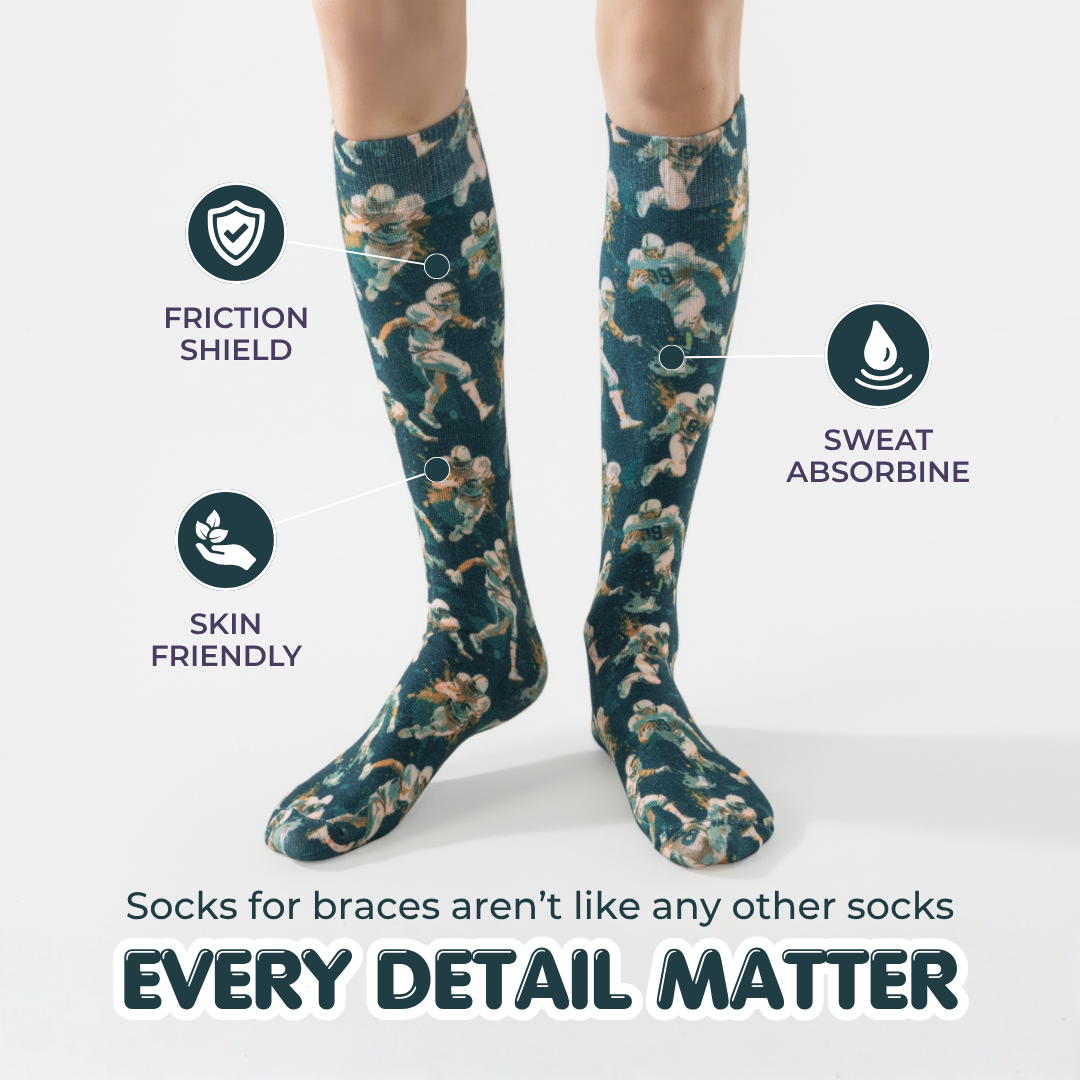 Socks designed specifically for AFO braces are best for kids. They reduce friction inside the brace, stay securely in place throughout the day, and help prevent skin irritation. Regular socks are not built for brace use and often cause discomfort or pressure points.