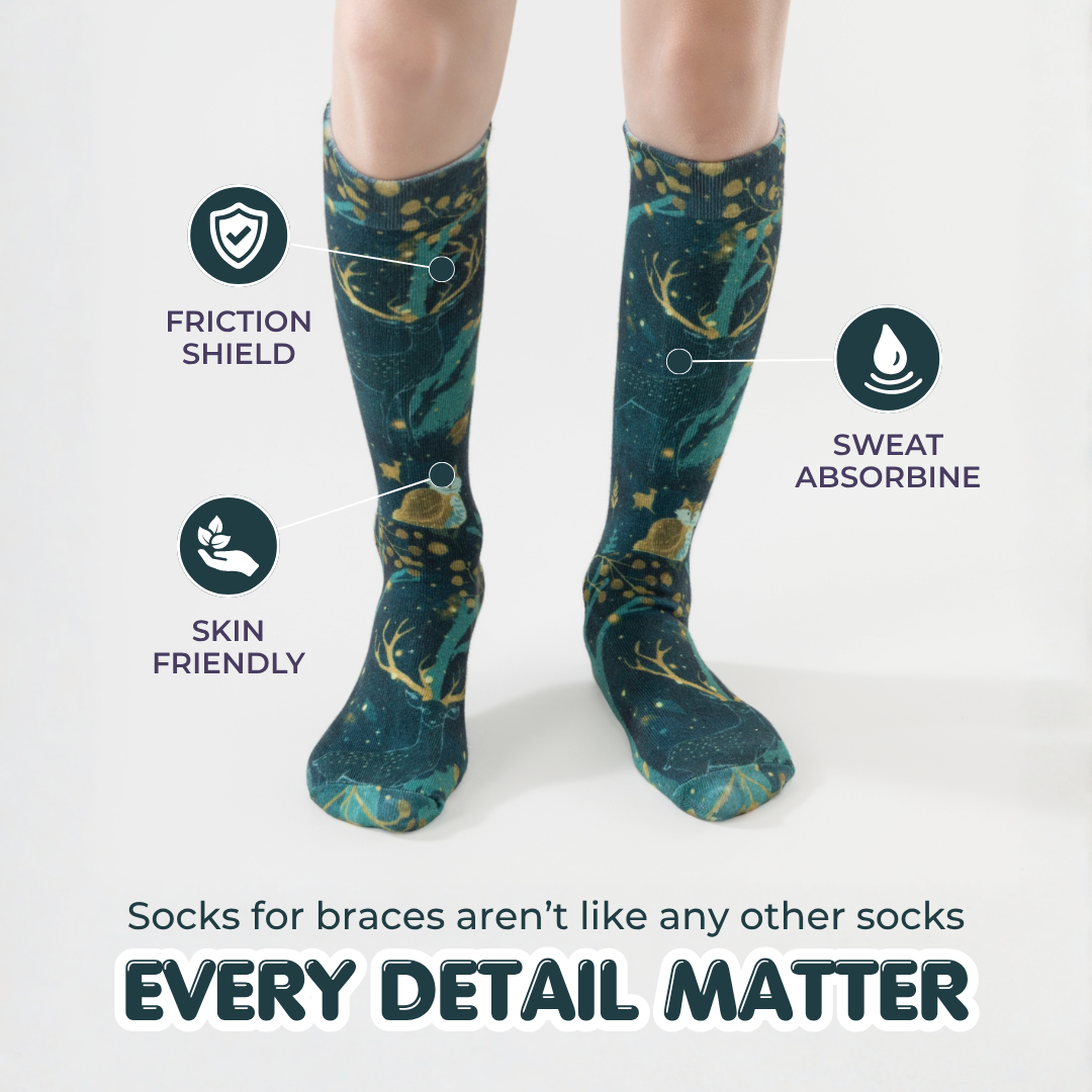 Socks designed specifically for AFO braces are best for kids. They reduce friction inside the brace, stay securely in place throughout the day, and help prevent skin irritation. Regular socks are not built for brace use and often cause discomfort or pressure points.