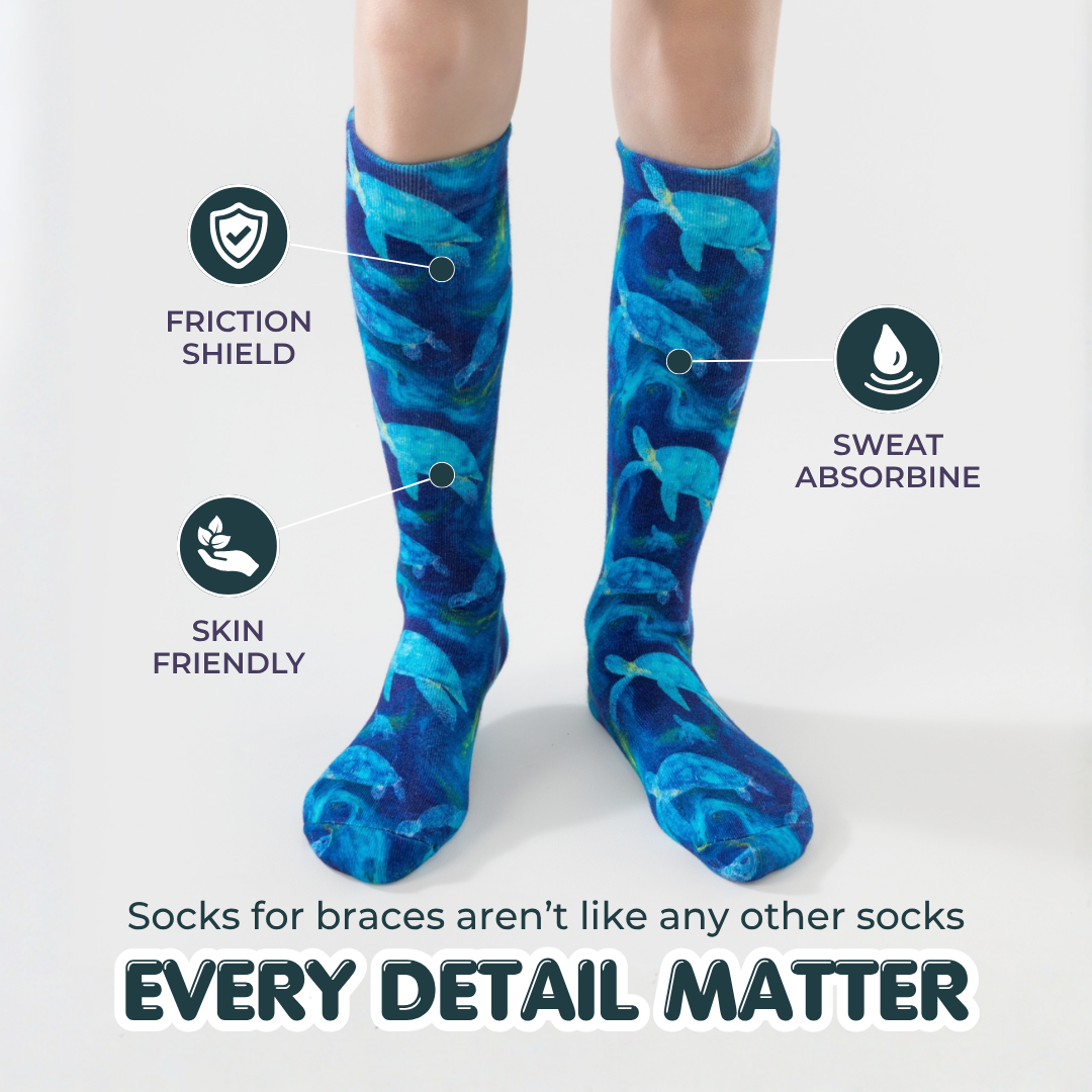 Socks designed specifically for AFO braces are best for kids. They reduce friction inside the brace, stay securely in place throughout the day, and help prevent skin irritation. Regular socks are not built for brace use and often cause discomfort or pressure points.
