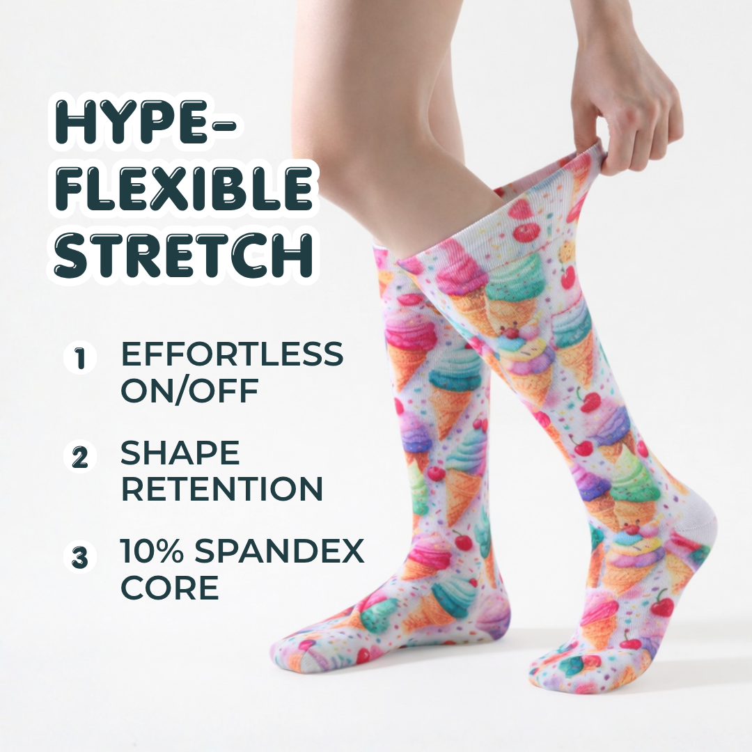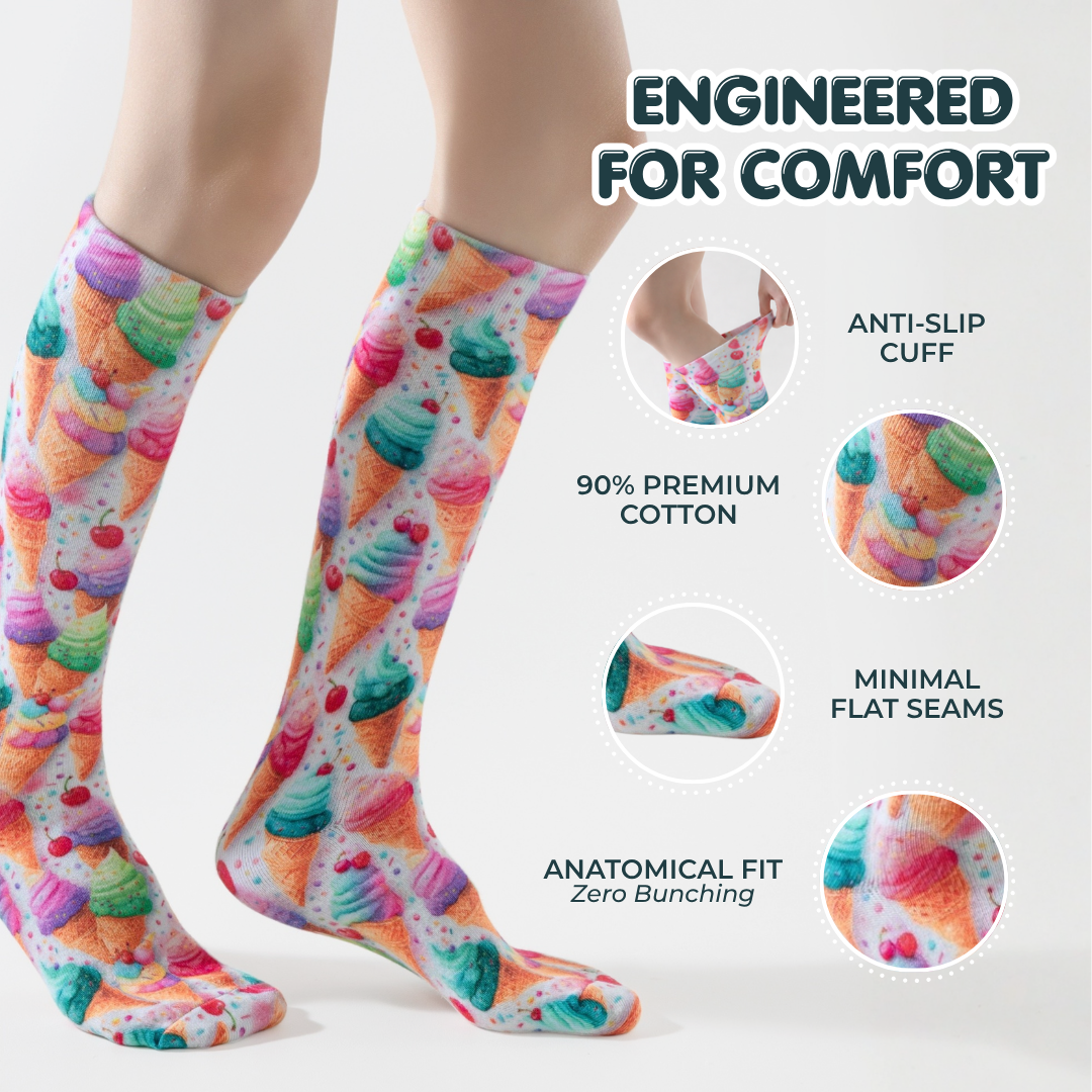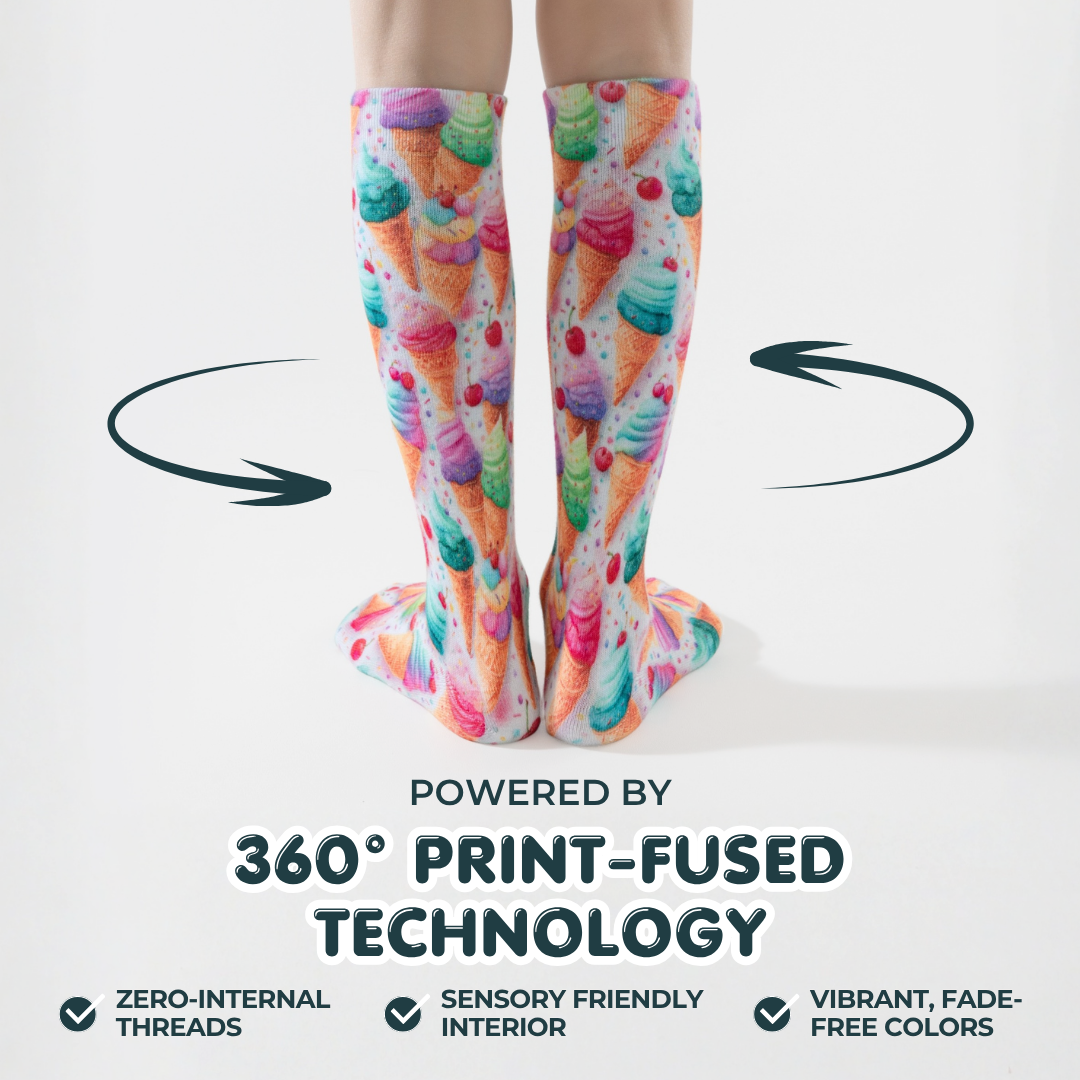 Using advanced 360° Sublimation Printing, we fuse ink directly into the fibers. Unlike Jacquard socks, our interior is completely smooth and white, eliminating the messy "float threads" that tickle and irritate sensitive skin.