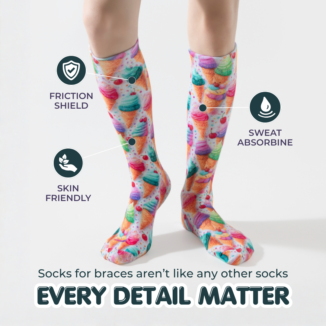 Socks designed specifically for AFO braces are best for kids. They reduce friction inside the brace, stay securely in place throughout the day, and help prevent skin irritation. Regular socks are not built for brace use and often cause discomfort or pressure points.